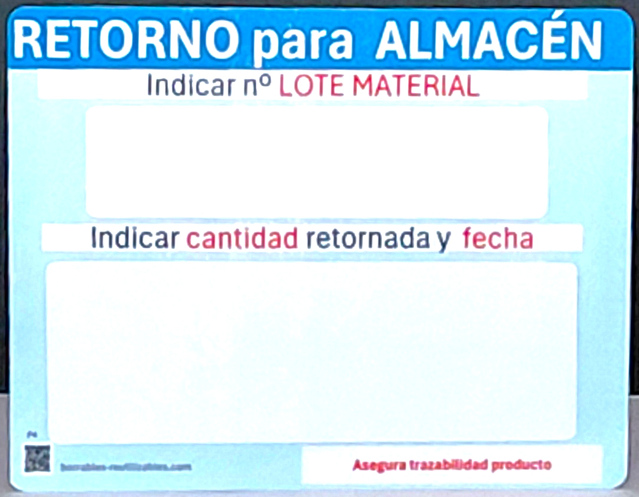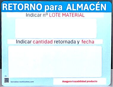 Esta etiqueta indica el nº de lote ,cantidad y fecha de retorno a almacén del material sobrante fabricación